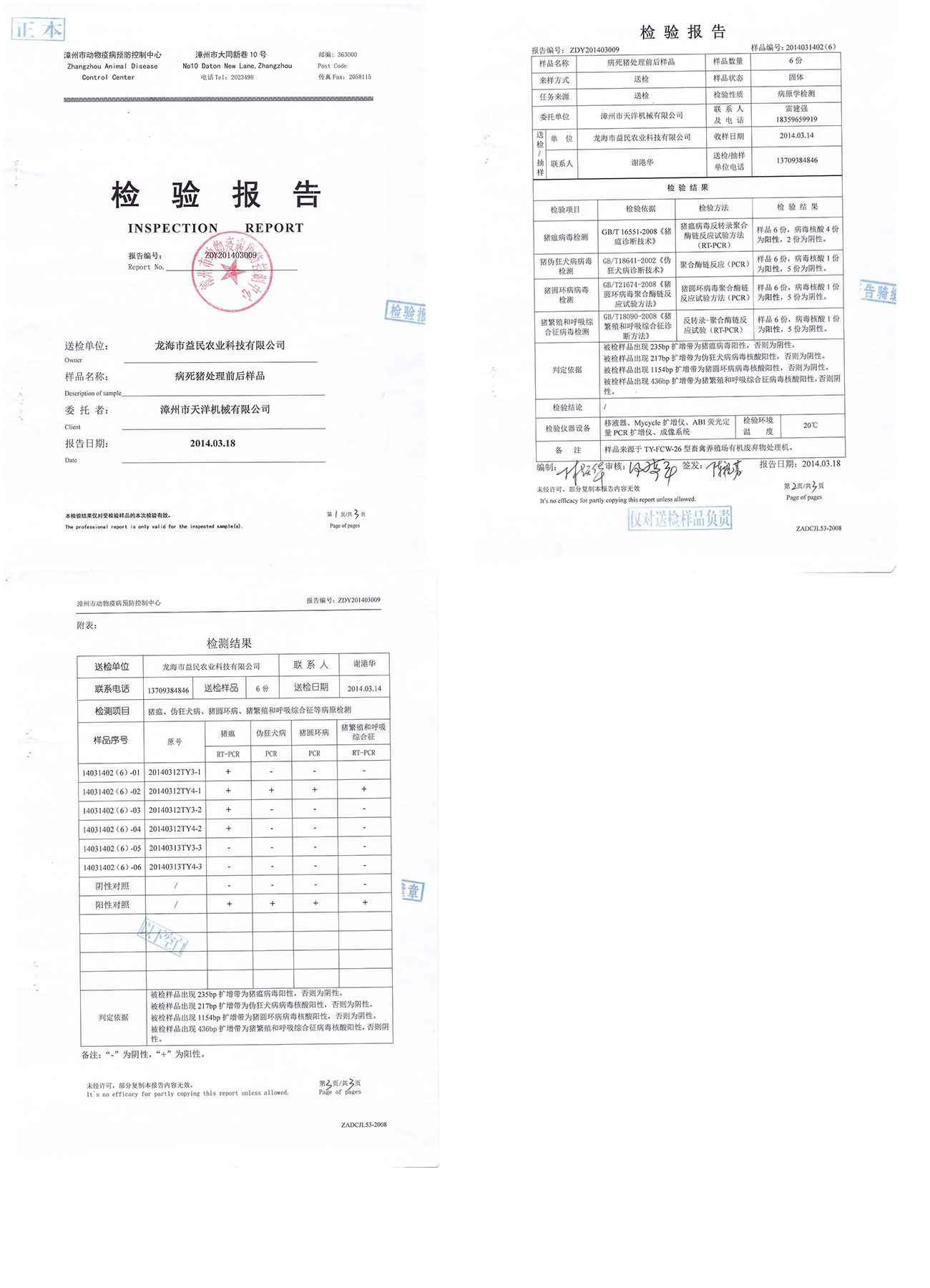 漳州市動物疫病預(yù)防控制中心檢驗報告--病死豬處理前后樣本